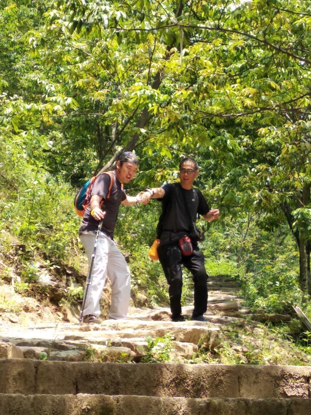 當天天氣晴朗,氣溫在32度左右,對整天待在辦公室的員工是個不小的考驗。初入古道,道路十分狹窄,很多地方只能單人通過,因為路不好走,小隊又分成兩個小組,方便互相照顧更方便順利前行,走在崎嶇的山間小路,可以想象曾經穿越在這條山路上的商旅們是如何的艱辛。寂靜的遠山,巍峨而高遠,濃密的植被,綠意盎然的包圍著這條山路。在獎勵的誘惑下,隊員們一股作氣爬上了古道的至高點,海拔1050米的藍天凹,藍天凹是徽杭古道風景最美的地方,佇立凹口,極目四眺,周圍群山拜倒于腳下,遠處叢巒疊嶂,風起云涌,空山靜谷,懾人心魄。坐在藍天凹簡陋的茶棚下,吹著徐徐的山風,所有的疲憊瞬間被吹散,心立馬就靜了下來,白云蒼狗,遠山如黛,小組第一已不是大家的目標,只想好好的看看這沿途的風景。