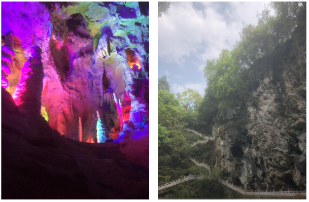 整個游玩過程中最讓人嘖嘖稱奇的是水洞坐船環節,蜿蜒曲折的狹窄河道,兩側的巖壁上滿是怪石嶙峋、形態各異的鐘乳石,在五彩斑斕的燈光映射下奇幻迷離氣象萬千。正當大家都沉浸到這種奇特的美景中時,忽而迎面一陣微風,豁然開朗,眨眼已到河道盡頭,只見崖壁上滿目郁郁蔥蔥~