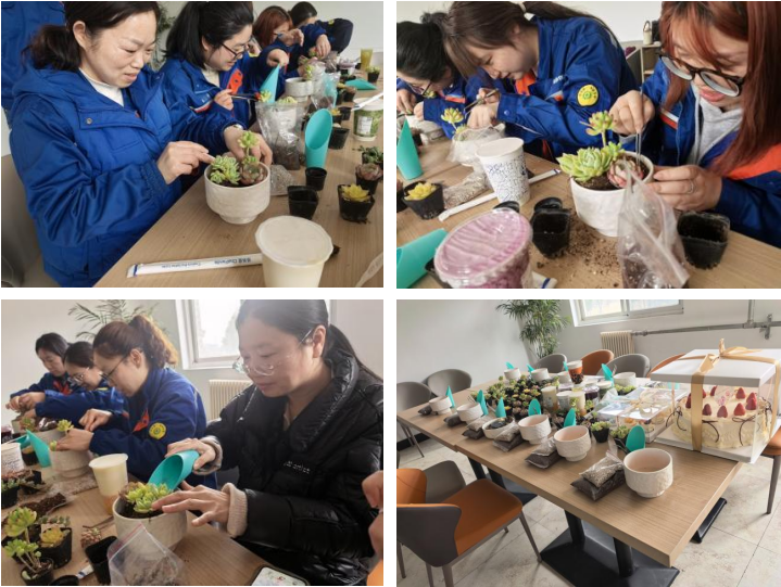 員工們通過親手組裝多肉植物盆栽,體驗到了種植的樂趣,感受到了春天的溫暖氣息。公司會議室被布置成了一個充滿自然氣息的綠色小天地。桌上擺放著各式各樣的多肉植物、花盆、土壤以及裝飾小石子等材料。經過一番精心的組裝,一盆盆形態各異、色彩斑斕的多肉植物盆栽呈現在大家面前。