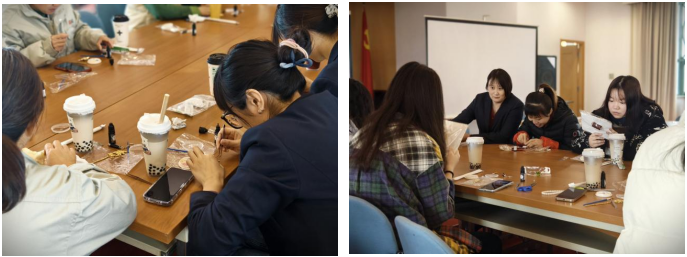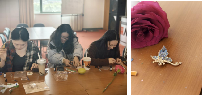 享用完美味的下午茶,活動進入了充滿文化韻味的體驗環節——纏花工藝和螺鈿工藝。大家迫不及待地動手嘗試,穿針引線、纏繞絲線,最終一朵朵纏花在大家手中逐漸成型,或粉嫩嬌俏的蝴蝶,或潔白無瑕的鈴蘭。